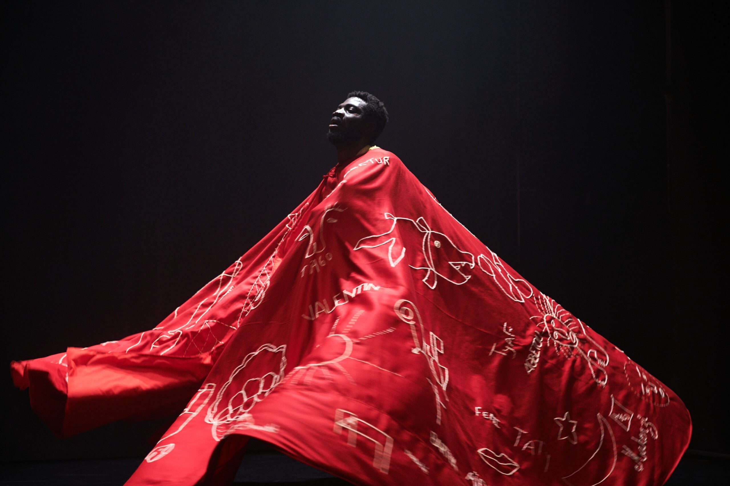 Die Tchekpo Dance Company, in Zusammenarbeit mit Elisabeth Masé, zeigt DER MANTEL / THE CLOAK. Ein Kunstwerk, das Brücken zwischen verschiedenen Kulturen und Gesellschaften schlägt. Die Akteure versammeln sich um einen Tisch und besticken einen Mantel aus schwerem rotem Leinen. Durch selbst gestaltete Texte und Ornamente definieren sie, was Schutz für sie bedeutet.