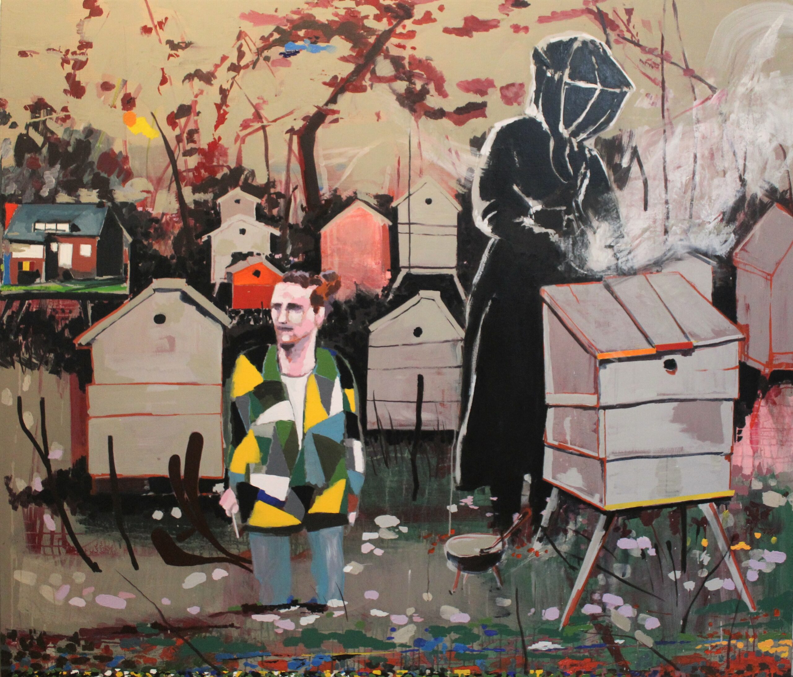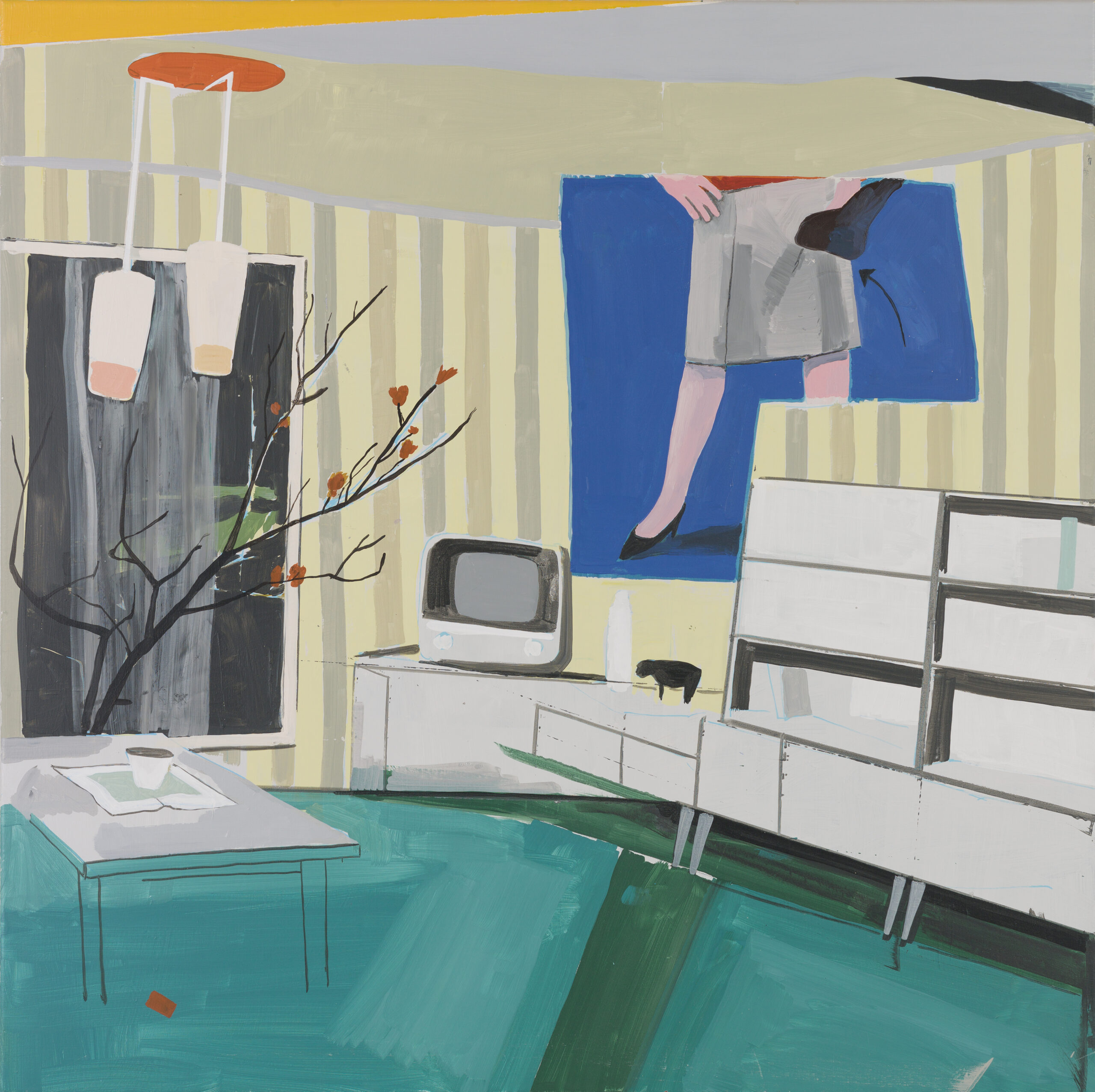 In seiner Arbeit funktioniert das Spiel mit den Beziehungen sowohl auf der Ebene der Menschen als auch auf der Ebene der Objekte. Von der Fernbedienung über das Auto bis hin zu Möbeln gibt es keine besondere Hierarchie bei den Zeichen. Die Gesichter und Silhouetten der Figuren, die aus alten Zeitschriften übernommen wurden, werden in seiner Farbpalette genauso behandelt wie die vertrauten Gegenstände, die sie umgeben. Große Farbfelder, die erst durch eine bestimmte Stimmung oder Körperhaltung zum Leben erweckt werden.